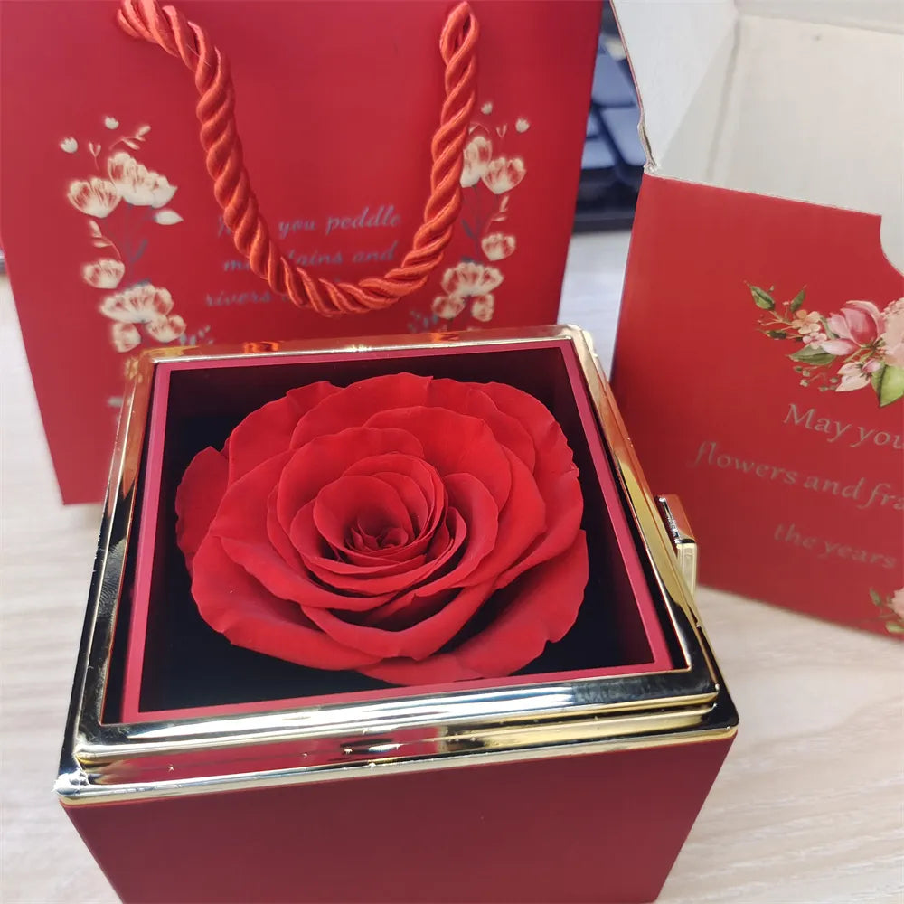 Each order comes with a beautiful case display containing the rotating rose and necklace, a gift bag with a thoughtful message written on it and a box for the rose case.